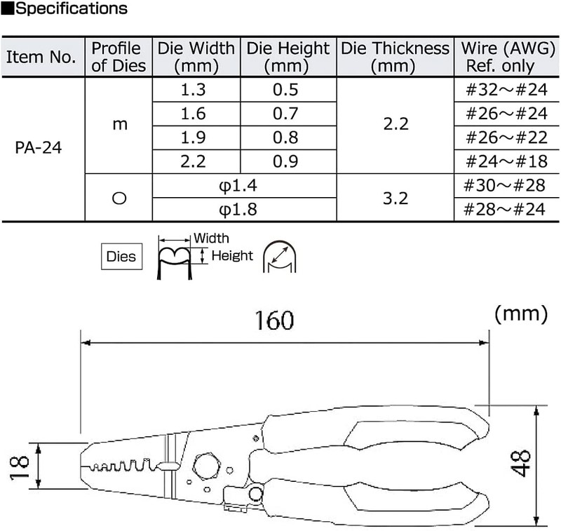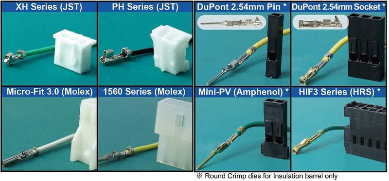 - ENGINEER’s new technology of die design offers super neat ‘curled’ crimping of 2.5mm pitch connector contacts (AWG #32-#18). Works with more than 170 different terminals such as JST XH, PH, EH & NH series, Molex Micro-Fit 3.0, KK series, etc.