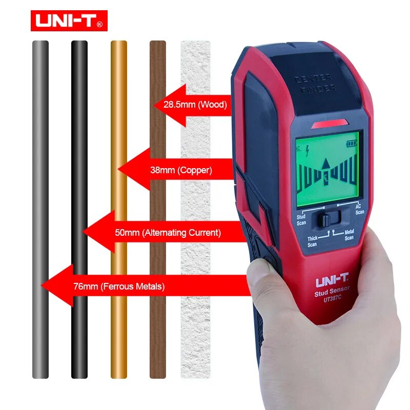 UT387C wall scanner enables you to detect electric wire, metal object, wooden beams accurately. The new and improved wall scanners are great tools for interior finish, renovation, furniture installation, flooring, pipe installation, and building construction.